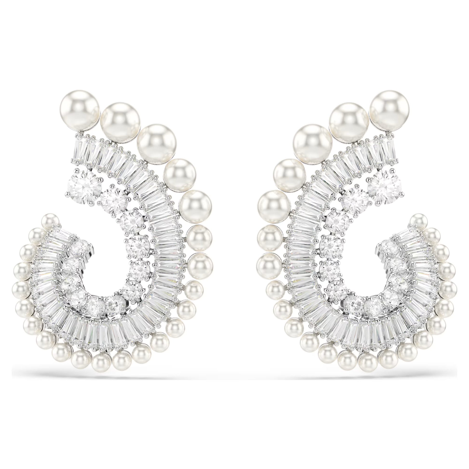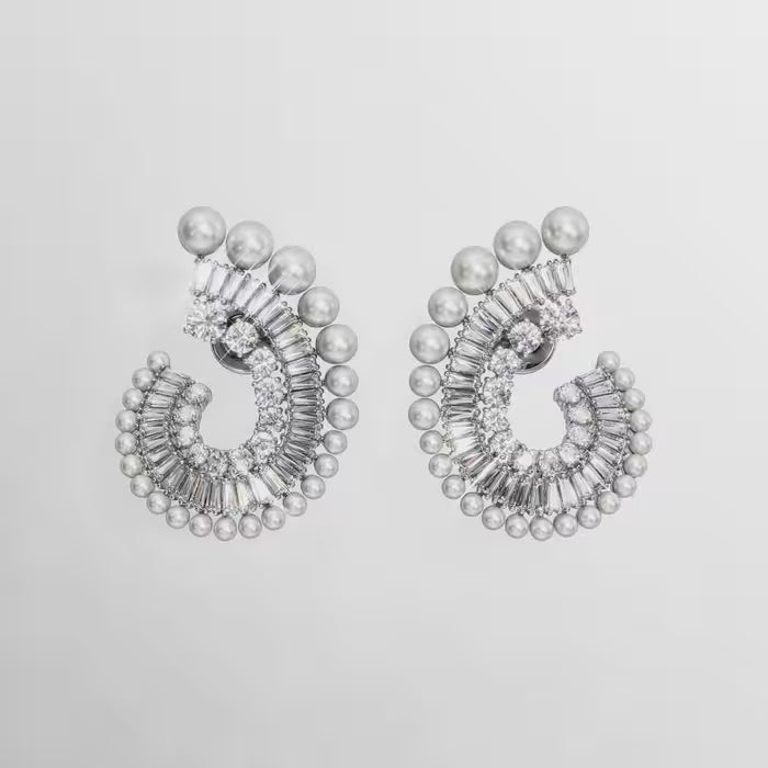 Swarovski’nin savoir-faire’iyle tamamlanan bu çarpıcı iğneli küpe, tüm kıyafetlere ışıltı katmanın ultra modern bir yolunu sunuyor. Rodyum kaplama her bir parça, farklı boyutlarda yuvarlak ve baget kesim Swarovski Zirkonya taşlarının oluşturduğu açık bir spiral tasarımıyla tamamlanıyor. Dış kısımda ise tasarım, ona lüks ve çekici bir dokunuş katan farklı boyutlarda sıralanmış Swarovski Kristal İncilerle tamamlanıyor. Aynı kreatif ailenin diğer parçalarıyla birlikte kolayca kullanılabilen parlak ve güzel bir küpe.